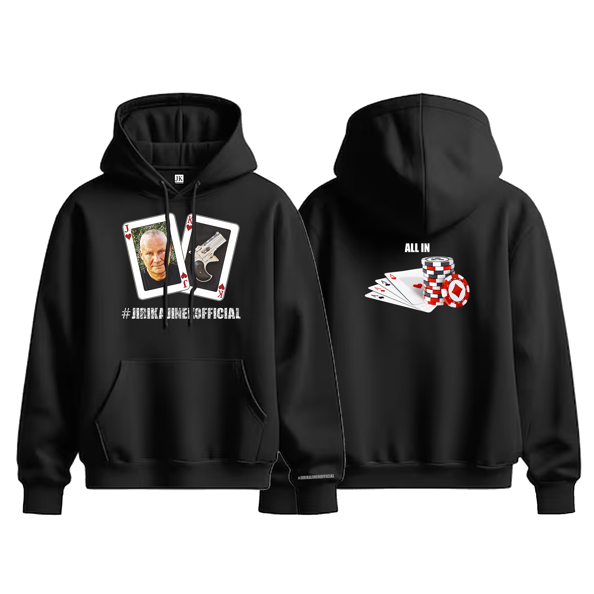 Stylová černá mikina z kvalitní bavlny, vybavená klokaní kapsou, kapucí a kvalitním potiskem nejnovější technologií, která zaručuje odolnost i při častém praní. Na přední části najdete motiv dvou pokerových karet s iniciály „J“ a „K“ (Jiří Kajínek) a pod nimi nápis #JiříKajínekOfficial. Na levém rukávu je decentní hashtag a na vnitřní straně u krku oficiální logo Jiří Kajínek official. Na zadní straně mikiny se objevuje pokerová tematika s kartami, žetony a nápisem „All In“.
