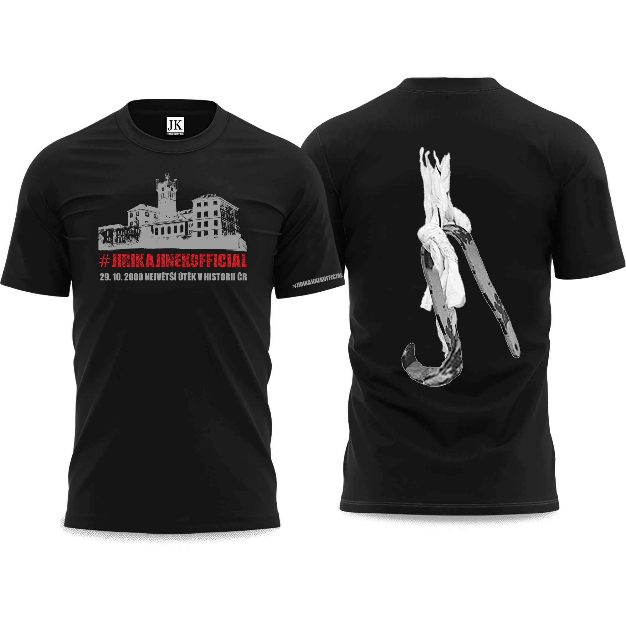 Stylové černé triko moderního střihu z kvalitní bavlny. Na přední straně se nachází obrázek věznice Mírov s nápisem #JiříKajínekOfficial a datem 29. 10. 2000, kdy Jiří Kajínek uprchl z věznice Mírov. Tento útěk je do dnes označován jako největší útěk v historii České republiky. Na zadní straně je zobrazen hák a část lana, které Jiří Kajínek použil při útěku. Na levém rukávu je decentní hashtag #JiříKajínekOfficial a na vnitřní straně u krku oficiální logo Jiří Kajínek official.