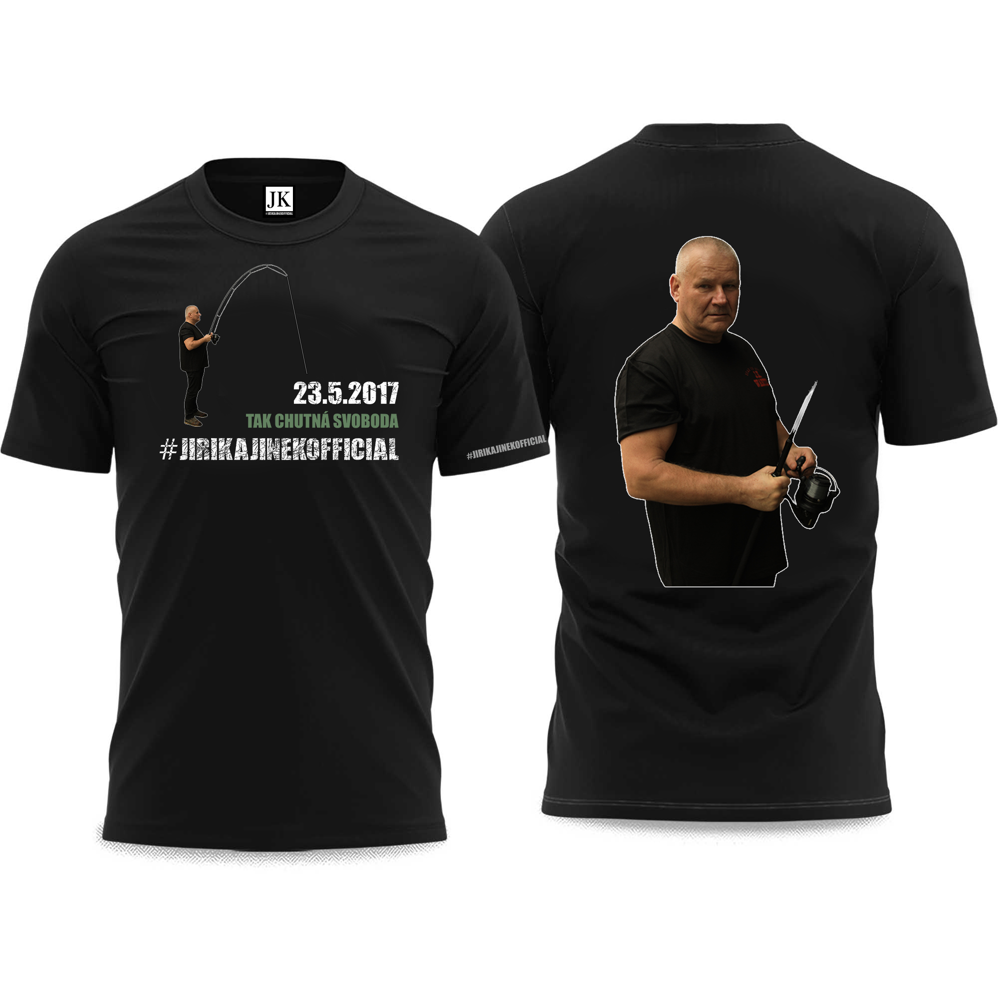 Stylové, černé triko moderního střihu z kvalitní bavlny. Na přední straně najdete detailní potisk nejnovější technologií, který odolává častému praní. Motivem je Jiří Kajínek s rybářským prutem, doplněný datem 23. května 2017 a nápisem „Tak chutná svoboda“, připomínající den jeho milosti prezidenta. Pod tímto nápisem je hashtag #JiříKajínekOfficial. Na zadní straně se pak nachází další fotografie Jiřího Kajínka s prutem. Na levém rukávu je decentní potisk #JiříKajínekOfficial a na vnitřní straně u krku oficiální logo Jiří Kajínek official. Triko je dostupné v pěti velikostech: S,M,L,XL a XXL